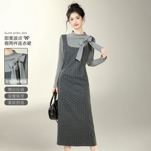 【假两件波点连衣裙】法式小香风蝴蝶结连衣裙秋冬高级感气质长裙