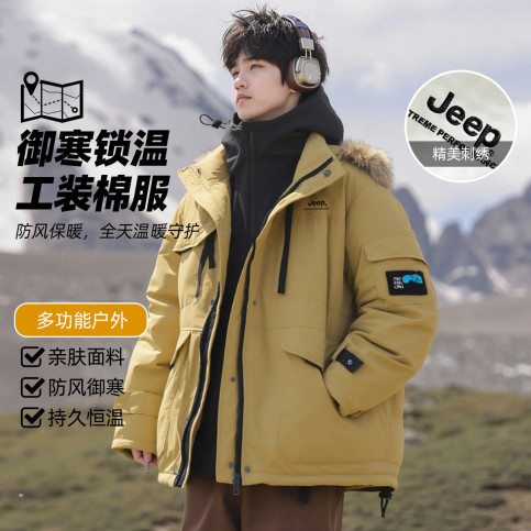 男士休闲外套秋冬厚工装防风保暖连帽可拆卸潮流时尚百搭棉服SJ